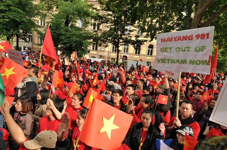Khoảng 1500 kiều bào đã cùng nhau giơ cao những tấm biểu ngữ bằng nhiều ngôn ngữ khác nhau để phản đối hành động của Trung Quốc. Ảnh Trần Minh Tâm