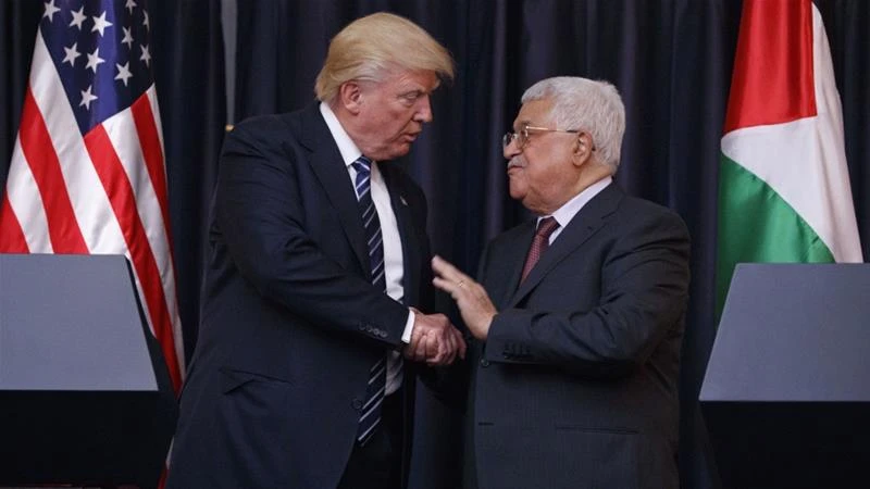 Tổng thống Mỹ Donald Trump (trái) bắt tay Tổng thống Palestine Mahmoud Abbas sau khi phát biểu trước báo giới ở TP Bethlehem thuộc khu Bờ Tây năm 2017. Ảnh: Evan Vucci/REUTERS
