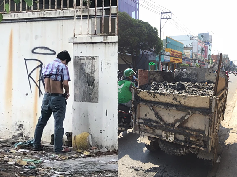 Người dân tiểu bậy (ảnh trái) và xe rác xả thải ra đường (ảnh phải) bị UBND phường 4, quận Tân Bình xử phạt vi phạm hành chính và bắt dọn dẹp hiện trường cho sạch đẹp trở lại. Ảnh: ĐT