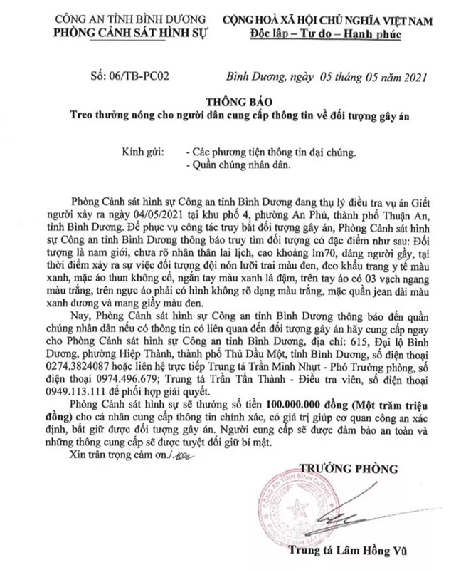 Thông báo số 06 của Phòng Cảnh sát hình sự Công an tỉnh