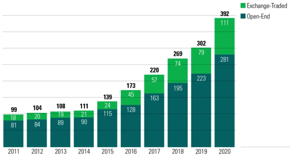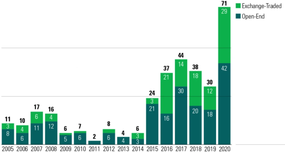 Số lượng các quỹ ESG mở mới đạt kỷ lục và vượt xa các năm trước đó. (Ảnh: Morningstar)