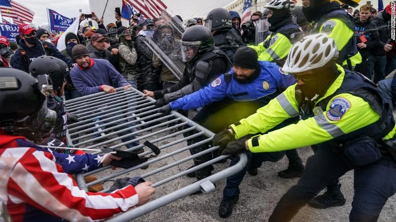 Những người ủng hộ Tổng thống Donald Trump phá hàng rào cảnh sát hôm 6-1 tại Điện Captiol. Ảnh: CNN
