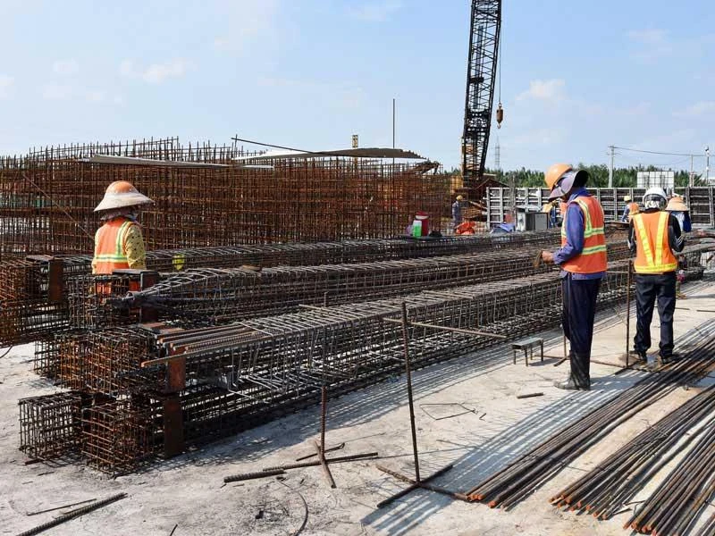 Công nhân đang thi công trên công trường cống Mương Chuối của dự án chống ngập 10.000 tỉ đồng. Ảnh: KC