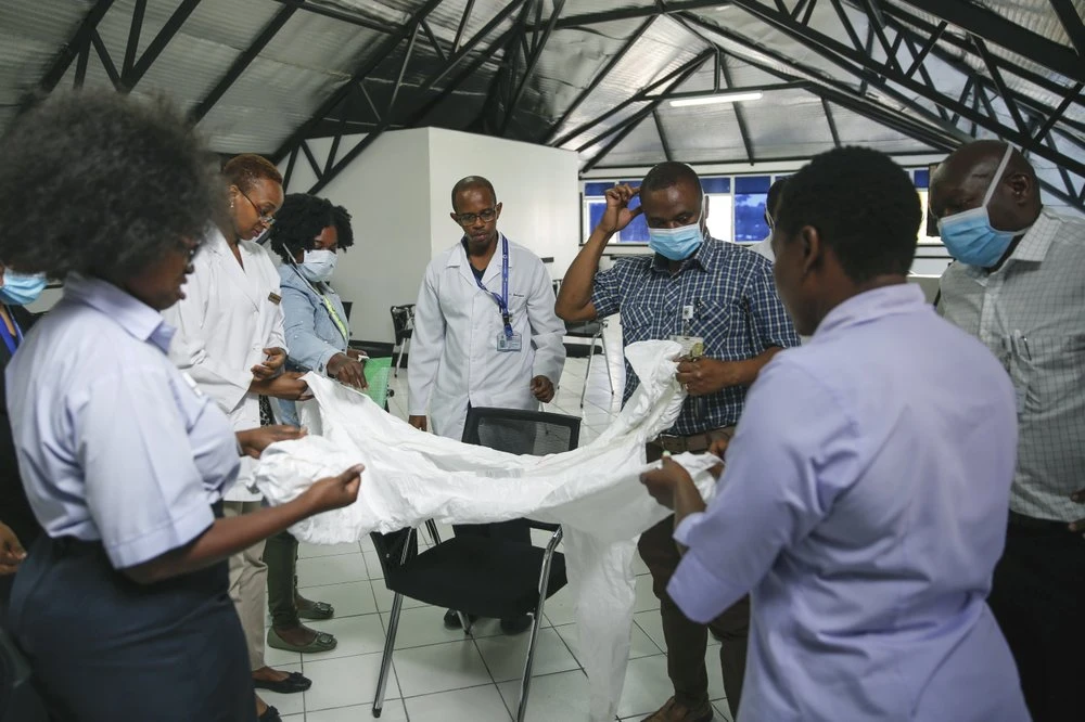 Các bác sĩ tìm hiểu cách sử dụng thiết bị bảo hộ trước khi đến đến điều trị cho bệnh nhân COVID-19 tại Bệnh viện Quốc gia Kenyatta ở thủ đô Nairobi, Kenya hôm 2-4. Ảnh: AP