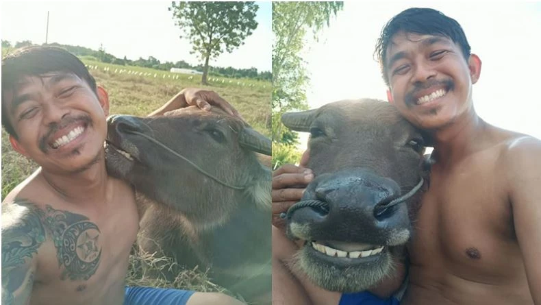 Tình bạn của Surat Paewkate với chú trâu Thong Kham được nhiều người thích thú. Ảnh: FACEBOOK