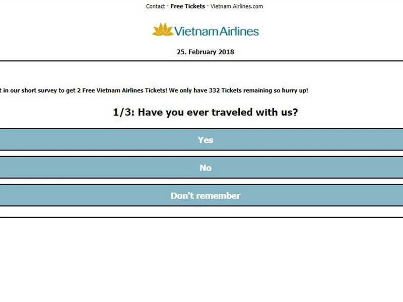 Theo Vietnam Airlines, thời gian gần đây, trên mạng xã hội xuất hiện thông tin giả mạo về chương trình tặng vé máy bay Vietnam Airlines miễn phí. Các thông tin này đều dẫn đến trang web http://vietnamair-flyer.club/ (ảnh dưới) với nội dung hứa hẹn tặng hai vé máy bay Vietnam Airlines cho khách hàng đăng ký tham gia và chia sẻ thông tin trên mạng xã hội. Nếu tham gia, khách hàng có thể bị kẻ xấu lợi dụng lấy cắp thông tin cá nhân hoặc vô tình tiếp tay cho hành vi lừa đảo trên mạng.