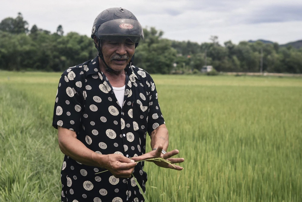 "Chú coi bông lúa này đi, nhìn nhiều hạt thế thôi nhưng dùng tay sờ thì chỉ có một vài hạt có sữa bên trong, còn lại là dẹp hết"- ông Phan Ngọc Doanh (68 tuổi) vừa ngắt một chẹn lúa dưới đồng lên chứng minh cho tác hại của thiếu nước trước và trong giai đoạn trổ bông.