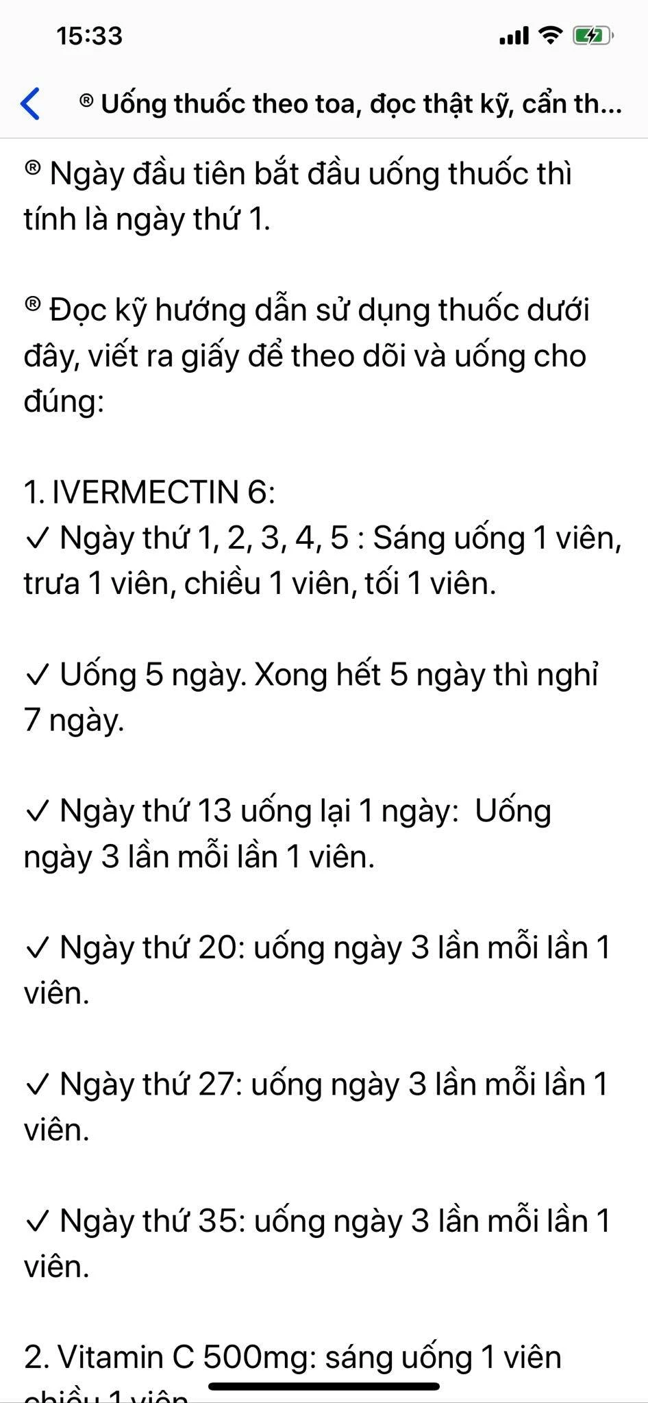 Gần đây, một số người dân phản ánh nhận được toa thuốc điều trị COVID-19, bên cạnh các loại thuốc sốt, ho, vitamin C thông thường thì có loại thuốc Ivermectin 6mg, uống liên tục từ ngày thứ 1 đến ngày thứ 5, sáng uống 1 viên, trưa 1 viên, chiều 1 viên, tối 1 viên. Sau đó, uống theo hướng dẫn rải rác đến ngày thứ 35.