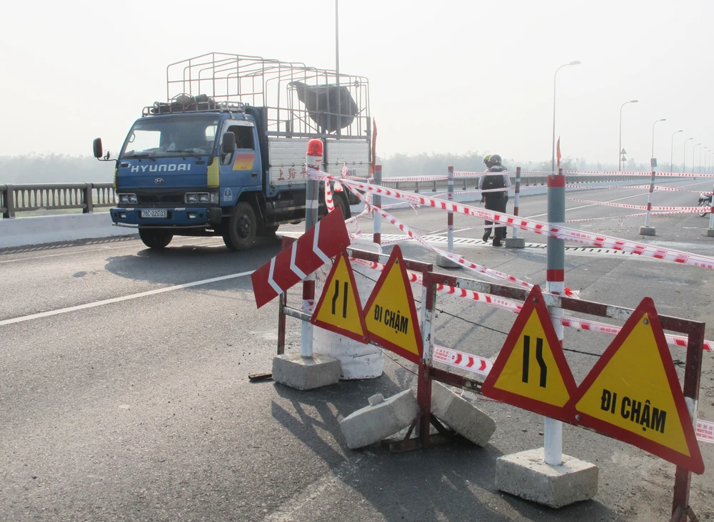 Gần một nửa mặt cầu Đà Rằng đã bị rào chắn do sự cố hư hỏng. Ảnh: TẤN LỘC