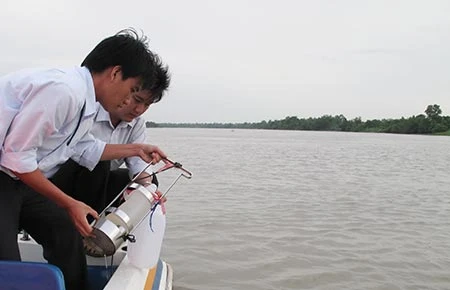 Cán bộ Trung tâm Y tế dự phòng TP.HCM kiểm tra chất lượng nguồn nước sông Sài Gòn tại khu vực lấy nước của Nhà máy cấp nước Tân Hiệp. Ảnh: TRUNG THANH