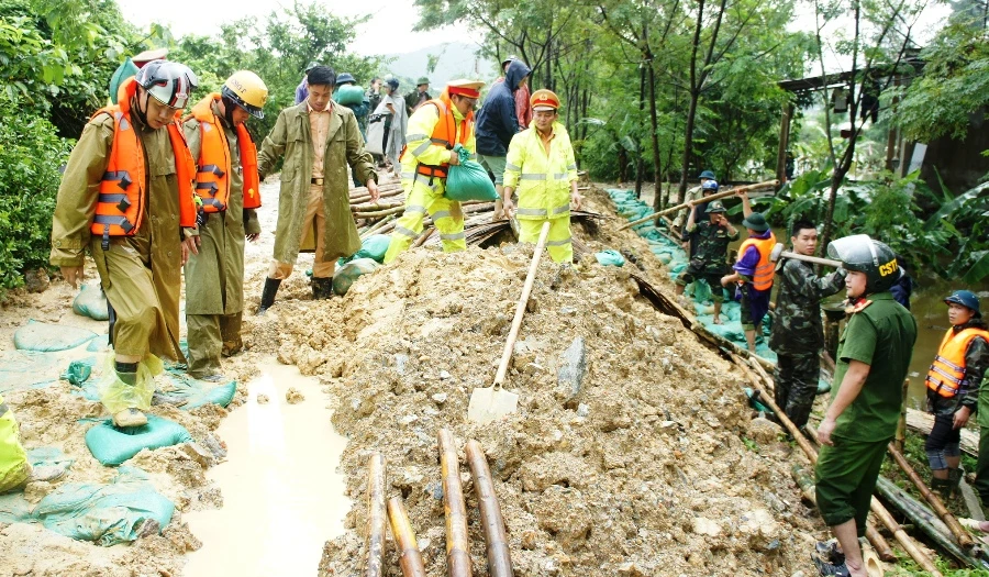 Trước đó, sáng 13-10, nước sông Vinh dâng cao khiến khoảng 60m đê xung yếu sông Vinh bị sạt lở nghiêm trọng, đe dọa đến tính mạng và tài sản của người dân.