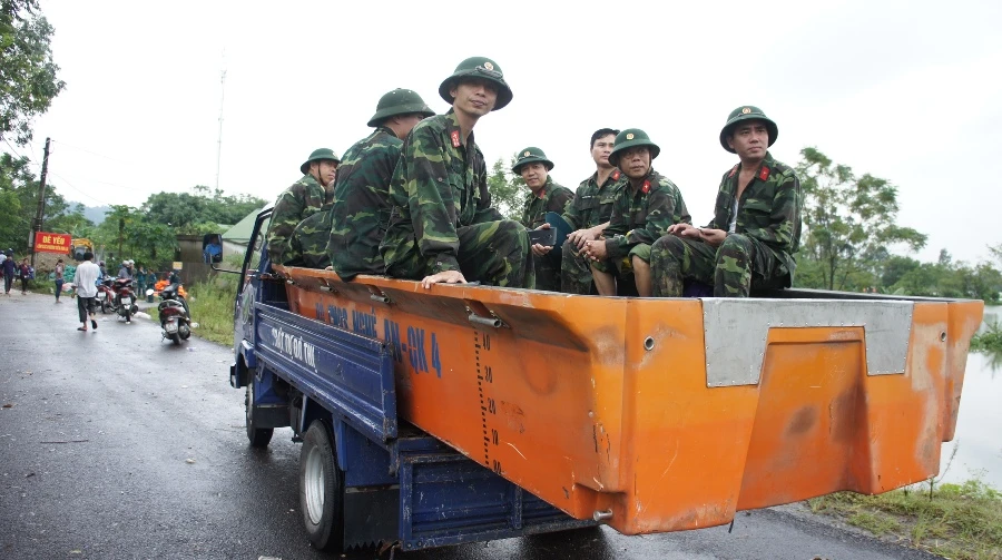 Quân khu 4 điều động các chiến sĩ cùng xuồng đến tham gia cứu đê, cứu dân.