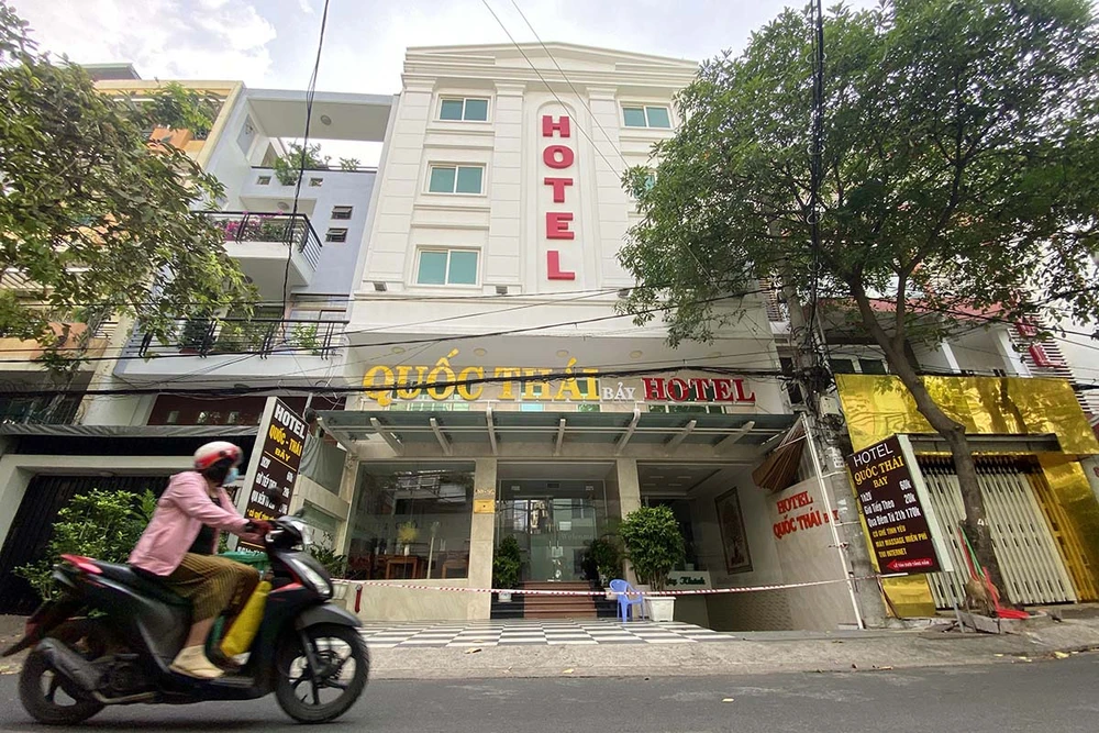 Khách sạn Quốc Thái ở xã Bình Hưng, huyện Bình Chánh, TP.HCM bị phong tỏa do liên quan ca nhiễm COVID-19 nhập cảnh trái phép. Ảnh: HOÀNG GIANG