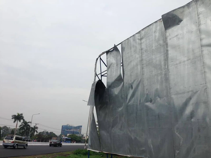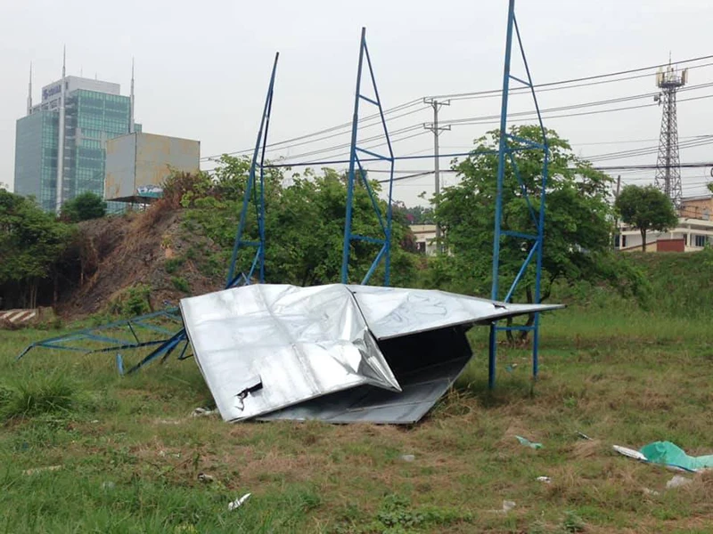 Cả hai bảng quảng cáo trên đều đã hư, các tấm tôn gắn trên trụ sắt đã hỏng, có bảng chân trụ đã bị gãy.