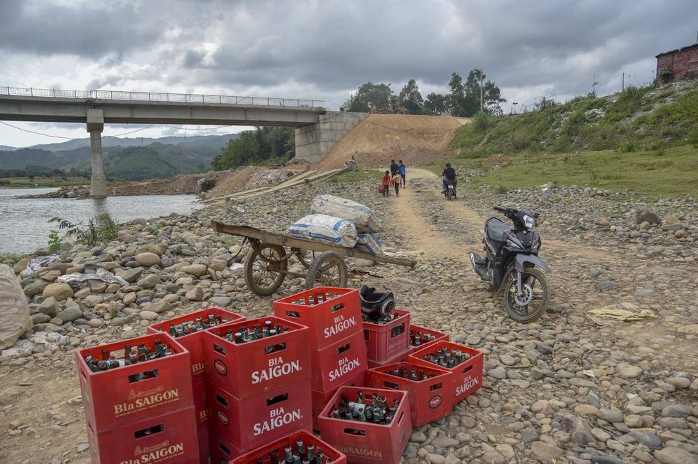 Phía sau là cây cầu đang được xây dựng. Ảnh: NGUYỄN DO