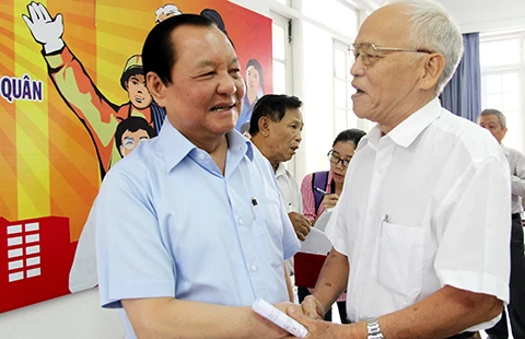 Đại biểu Quốc hội Lê Thanh Hải, nguyên ủy viên Bộ Chính trị, nguyên Bí thư Thành ủy TP.HCM, trao đổi với cử tri quận 5 sáng 14-4. Ảnh: HOÀNG GIANG