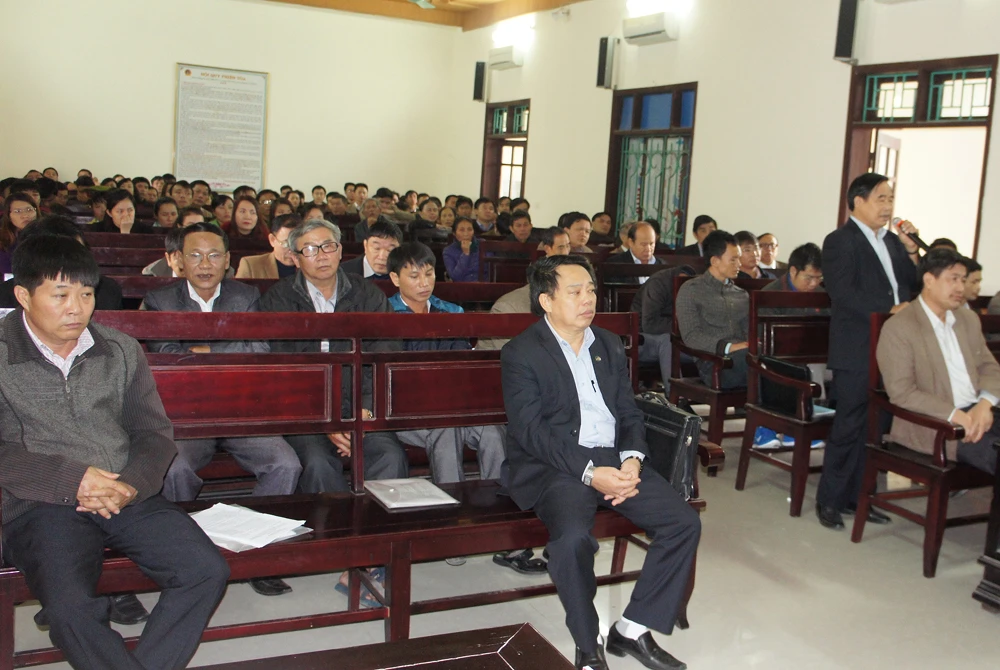 Sáng nay (30-11), TAND tỉnh Hà Tĩnh tiếp tục xét xử sơ thẩm vụ án cố ý làm trái quy định của Nhà nước về quản lý kinh tế gây hậu quả nghiêm trọng đối với bị cáo Nguyễn Văn Bổng - nguyên chủ tịch UBND huyện Kỳ Anh kiêm chủ tịch Hội đồng Bồi thường giải phóng mặt bằng huyện, bị cáo Phạm Huy Tường - nguyên trưởng Phòng TN&MT huyện Kỳ Anh và năm bị cáo khác.
