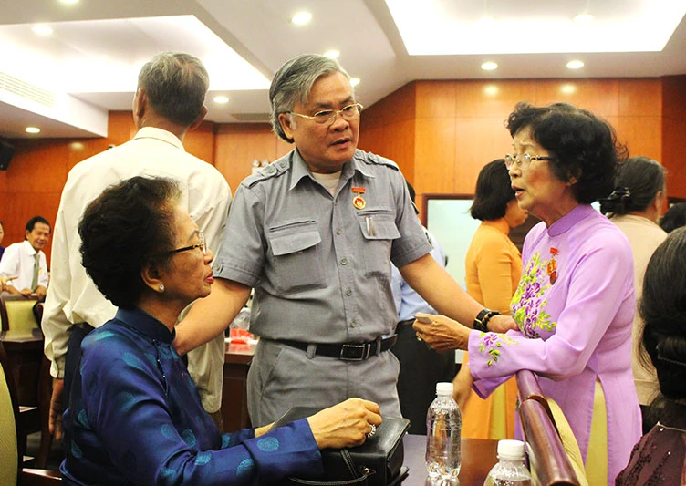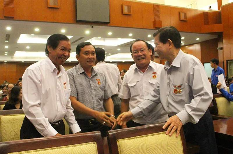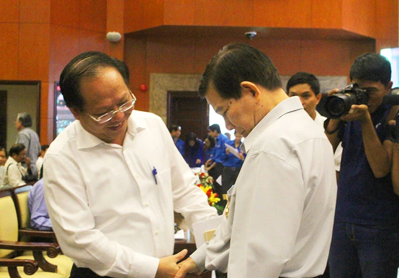 Nguyên Chủ tịch nước Nguyễn Minh Triết (bìa phải) gặp gỡ Phó Bí thư Thường trực Thành ủy TP.HCM Tất Thành Cang. Ảnh: LÊ THOA