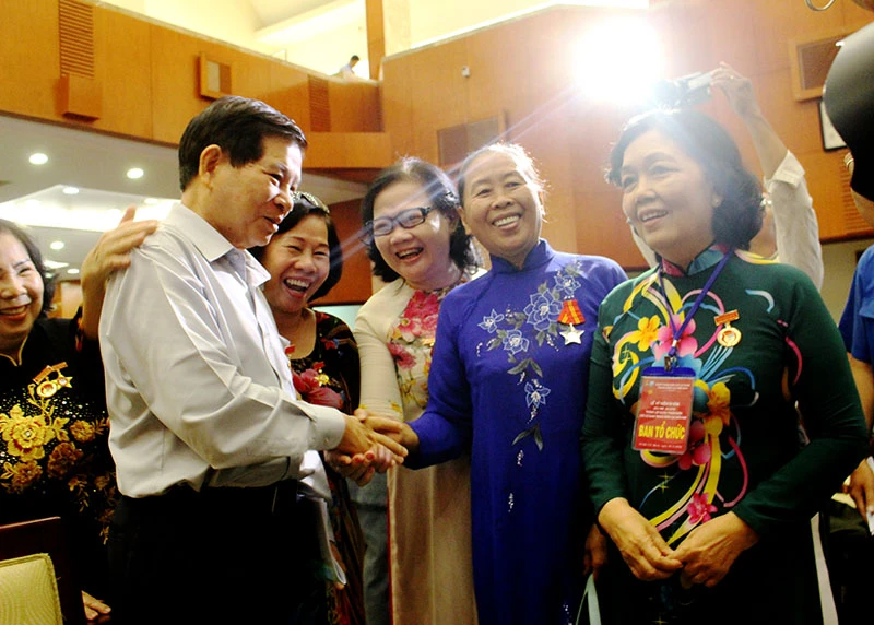 Nguyên Chủ tịch nước Nguyễn Minh Triết gặp gỡ các đại biểu tại buổi lễ. Ảnh: LÊ THOA