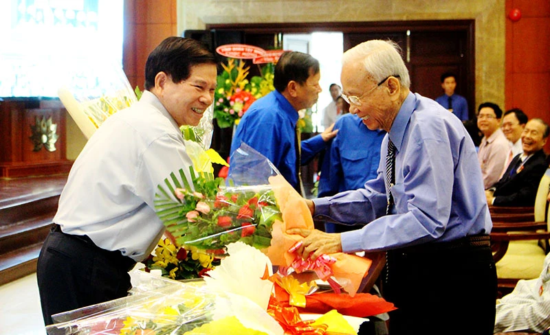 Nguyên Chủ tịch nước Nguyễn Minh Triết tặng hoa cho ông Phan Minh Tánh - Nguyên Trưởng ban Dân vận Trung ương, nguyên Phó Bí thư Thành ủy TP.HCM. Ảnh: LÊ THOA