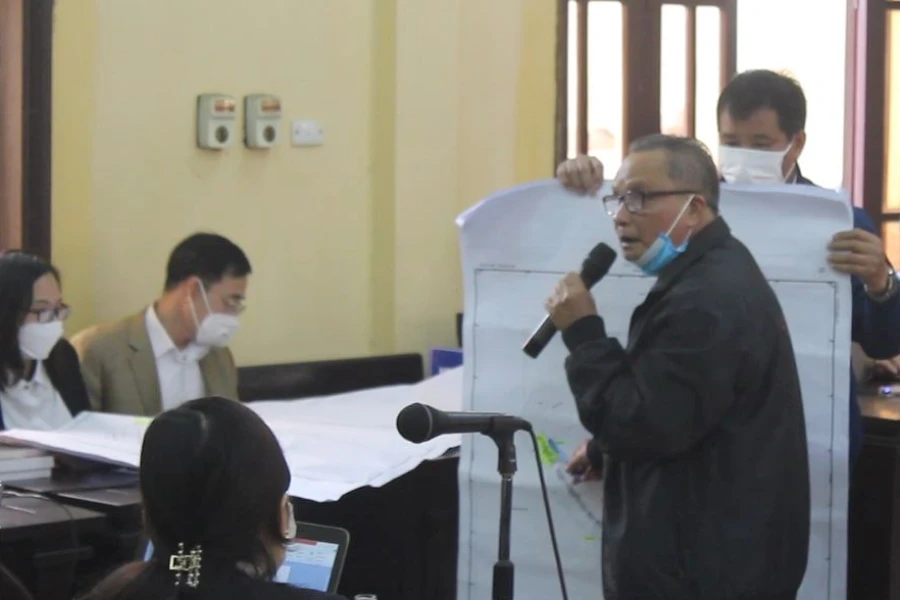 Bị cáo Chân đưa sơ đồ đất ra trình bày tại phiên tòa sơ thẩm.