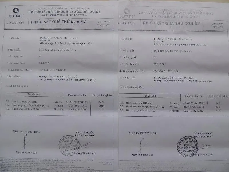 Như Pháp Luật TP.HCM đã thông tin, cuối tháng 1-2015, trong số các mẫu phân bón do Trung tâm Kỹ thuật Tiêu chuẩn đo lường chất lượng 3 thử nghiệm không đạt chất lượng có lô phân NPK 20-20-15+TE (100 bao, loại 50kg/bao), là sản phẩm phân bón cao cấp của Công ty cổ phần Quốc tế Hải Âu, đang lưu kho tại cửa hàng Út Hoành, xã Thái Bình Trung, huyện Vĩnh Hưng (Long An).