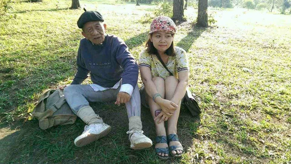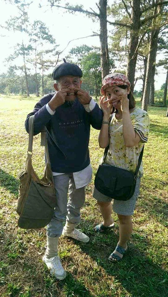 Lão "ngoan đồng" đồi Phương Bối và nhà báo Cẩm Tú đùa vui. Ảnh: FBTN
