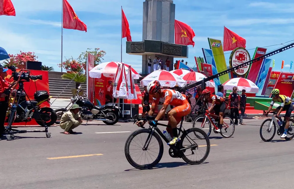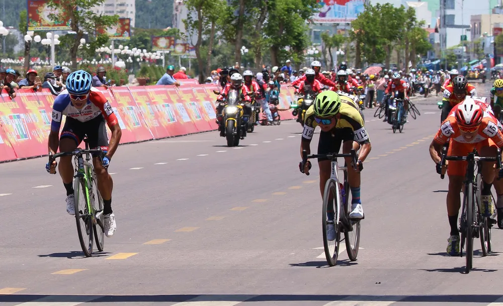 Nguyễn Dương Hồ Vũ (phải) từ phía sau vượt lên giành chiến thắng tại mức đến Quy Nhơn. ẢNH: HUỲNH VĂN THUẬN