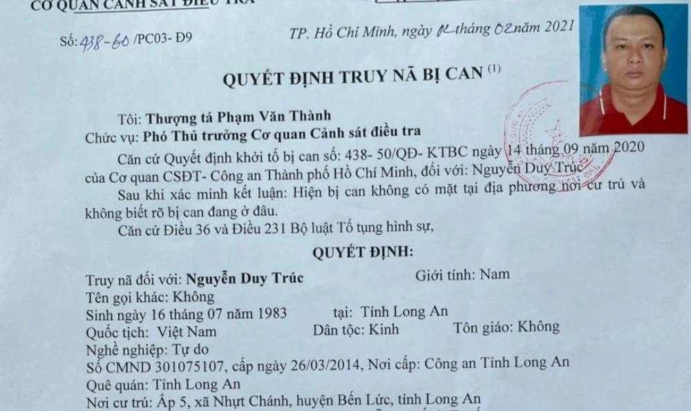 Ngày 19-2, Cơ quan CSĐT Công an TP.HCM phát đi truy nã bị can Nguyễn Duy Trúc (38 tuổi, quê Long An) để điều tra vụ lừa đảo chiếm đoạt tài sản xảy ra tại Công ty TNHH Chemilens có trụ sở tại quận Bình Thạnh, TP.HCM.