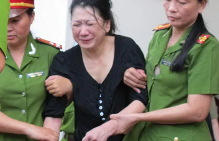 Lúc đầu bị cáo Thật chỉ nhắm mắt ngồi im nhưng khi HĐXX vào trong hội ý, bà khóc lóc, la lối om sòm. Ảnh: HOÀNG NAM