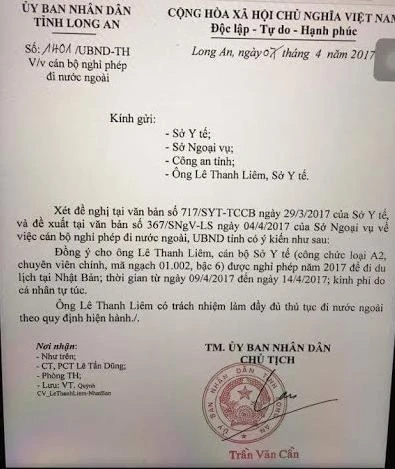 Văn bản chủ tịch UBND tỉnh Long An cho phép ông Liêm đi du lịch Nhật Bản sáu ngày.