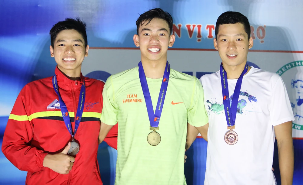 Nguyễn Huy Hoàng (giữa) trên bục nhận HCV cự ly 800 m tự do nam cùng Kim Sơn và Tấn Triệu. Ảnh: PHẠM HUY