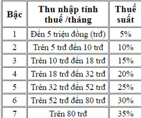 Thuế suất TNCN được áp dụng theo biểu thuế lũy tiến từng phần quy định tại Phụ lục 01/PL-TNCN theo Thông tư 111/2013 của Bộ Tài chính.