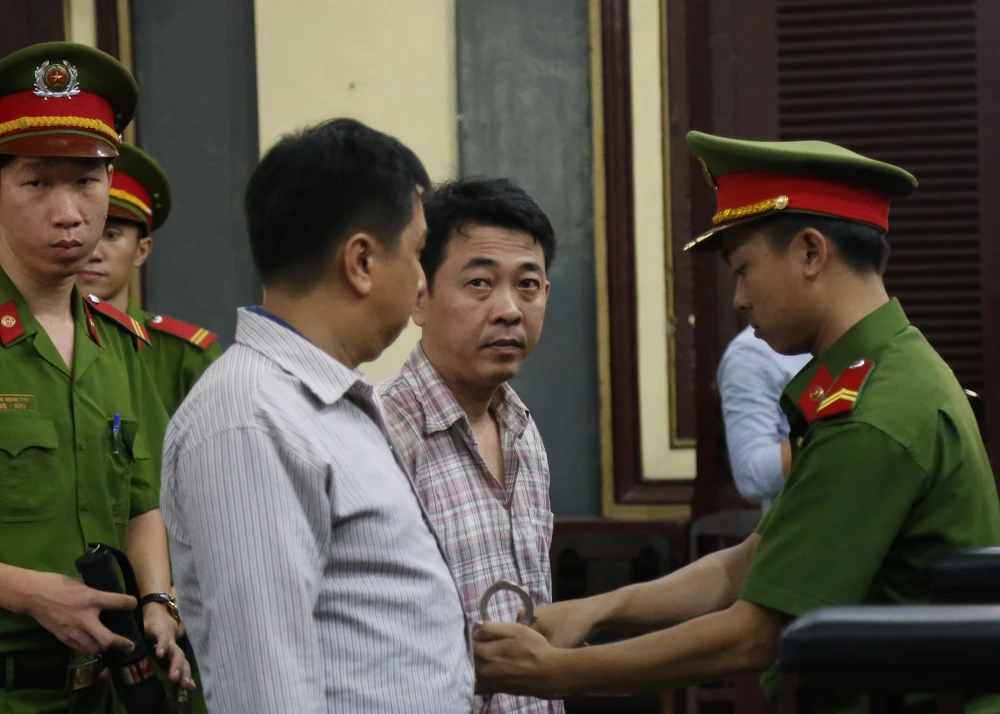 Bị cáo Nguyễn Minh Hùng và Võ Mạnh Cường được dẫn giải đến tòa chiều 24-10. Bị cáo Hùng trông tiều tụy, dáng vẻ mệt mỏi sau một ngày bị tạm giam.