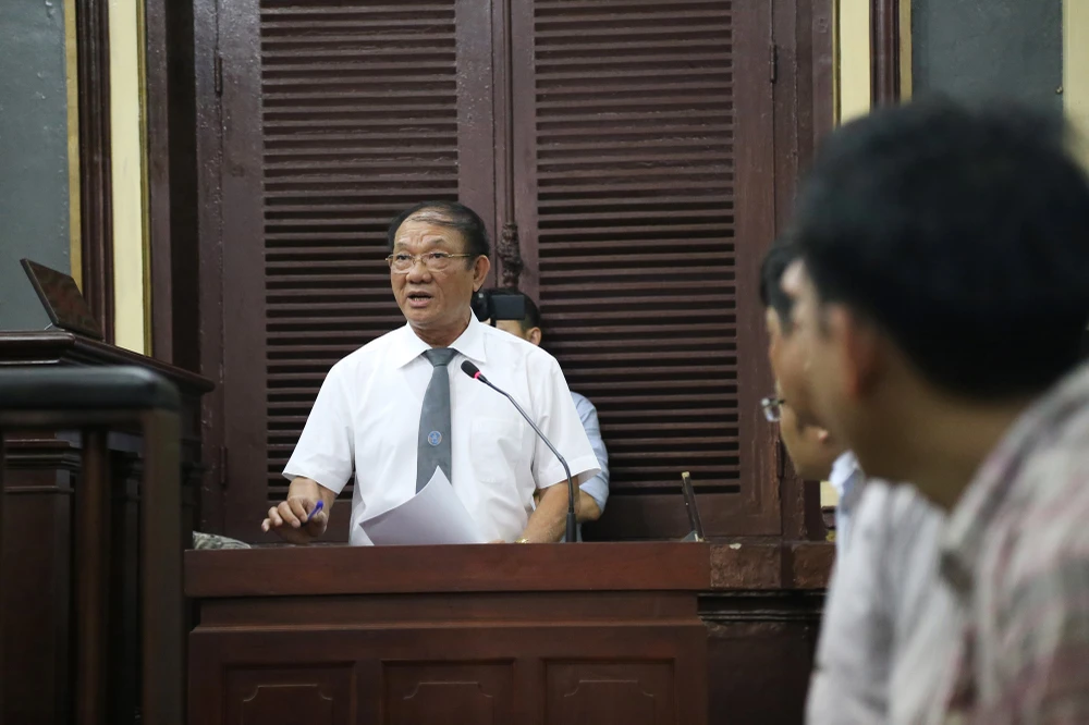 Bị cáo Hùng nghe luật sư của mình tranh luận với đại diện VKS về lệnh bắt tạm giam.