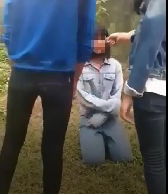 Em Hồ Thị P.T (lớp 7) bị nhóm nữ sinh lớp 8 bắt quỳ rồi đánh.