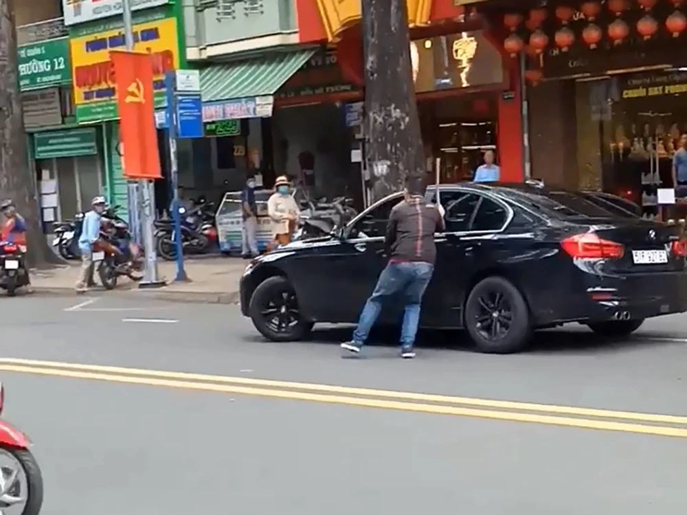 Hình ảnh cho thấy chiếc ô tô hiệu BMW biển số TP.HCM chạy ngang trên đường, bên cạnh có nam thanh niên cầm gậy đập vào cửa kính.
