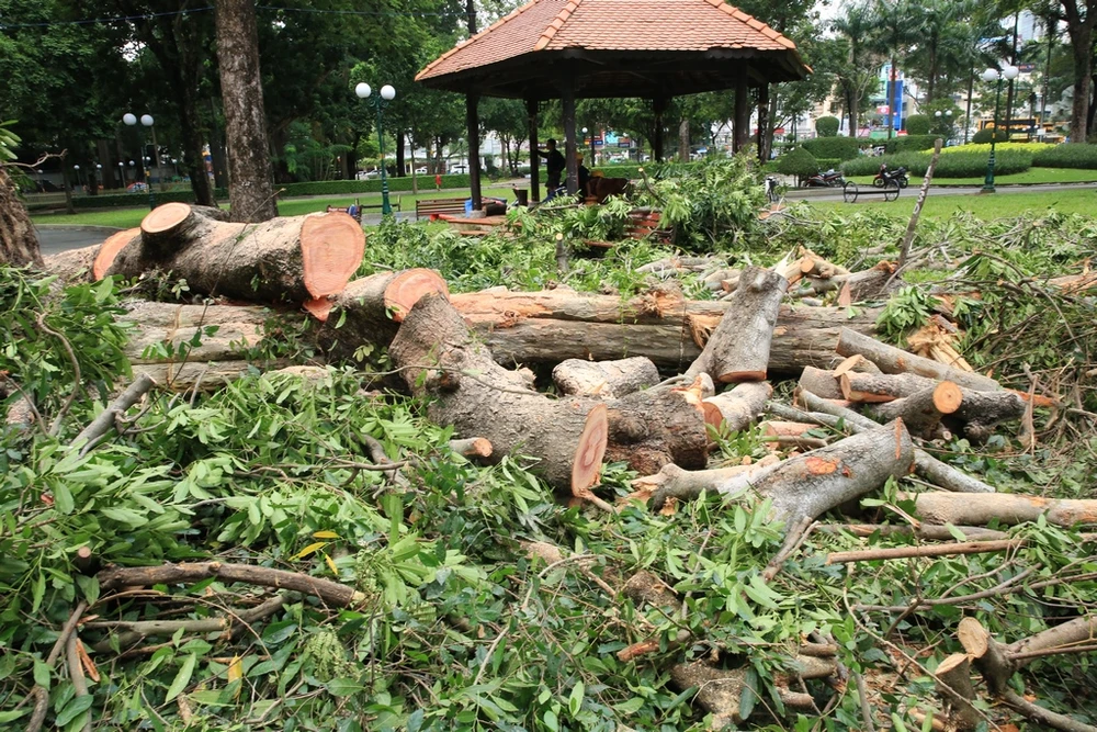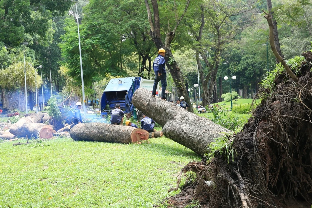 Hiện tại nhân viên Công ty TNHH MTV Công viên Cây xanh TP.HCM đã khắc phục xong sự cố, phân nhỏ thân cây mang ra khỏi công viên.