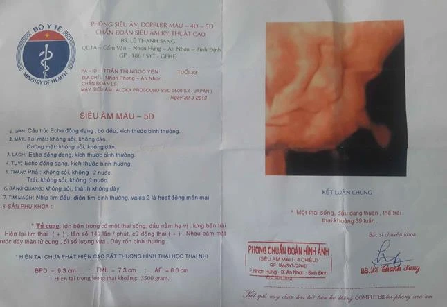 Trước đó, chiều 22-3, người thân đưa chị Y. đến một phòng siêu âm ở phường Nhơn Hưng, thị xã An Nhơn để siêu âm thai. Kết quả siêu âm ghi nhận thai nhi nặng 3,5 kg, đầu đang thế thuận, thai khoảng 39 tuần và không có dấu hiệu bất thường nào.