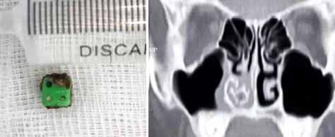 Cục xí ngầu lấy ra từ hốc mũi phải, bị vùi trong mô sùi dễ chảy máu và hình ảnh CT scan theo dõi khối u hốc mũi phải. Ảnh: BVCC