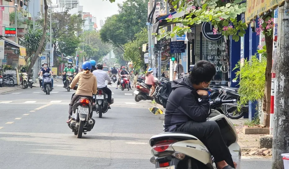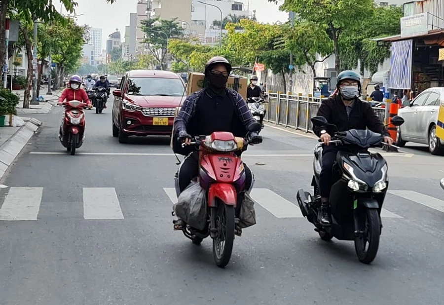 Khoảng 9 giờ sáng người dân mặc áo lạnh ra đường ở TP.HCM. Ảnh: NGUYỄN CHÂU