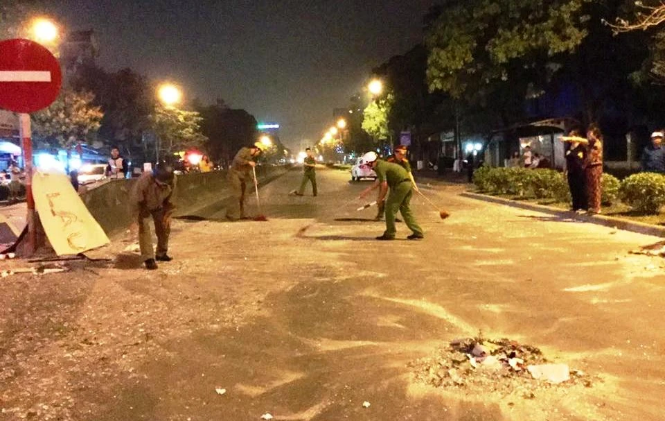 Công an và lực lượng chức năng thu dọn mảnh vỡ trên đường.