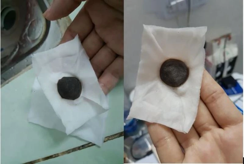 Miếng bông bịt vòi nước khoảng vài giờ, tháo ra thì đóng cặn đen. Ảnh: LP