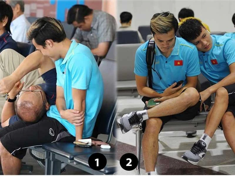 Thầy Park nằm trên đùi học trò trao đổi thật thân mật (ảnh 1) trong khi hai cầu thủ của Hà Nội và HA Gia Lai là Quang Hải và Văn Toàn tựa vào nhau thật thân thiện và hồn nhiên (ảnh 2).