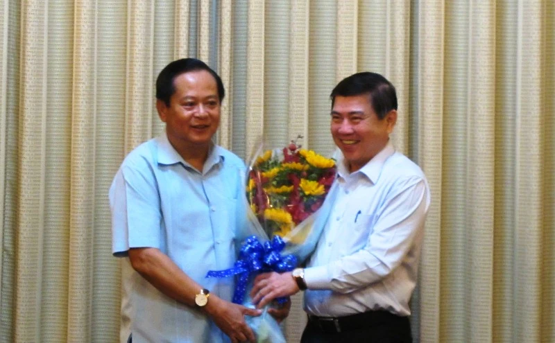 Chủ tịch UBND TP.HCM Nguyễn Thành Phong trao quyết định nghỉ hưu cho ông Nguyễn Hữu Tín.