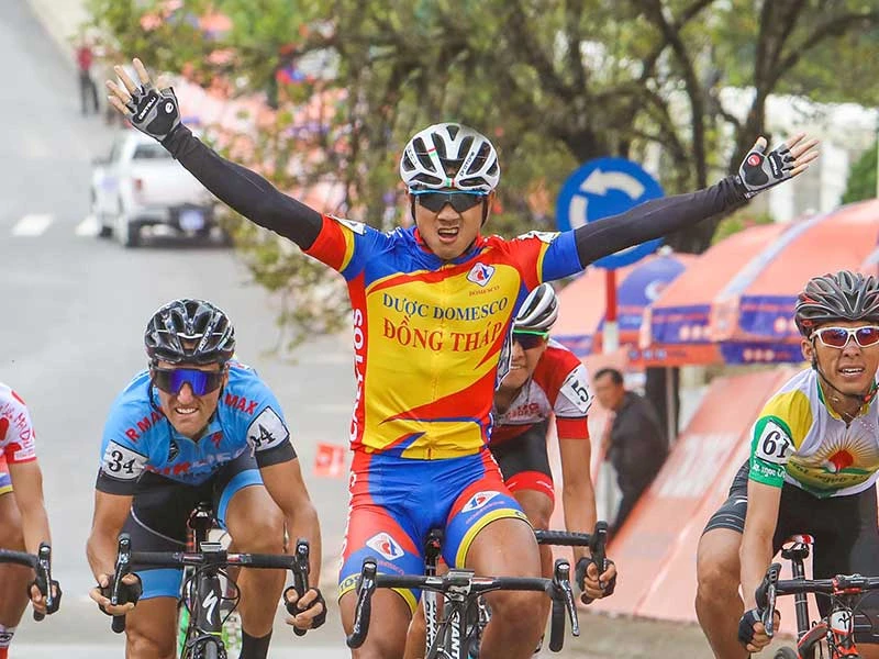 Chiến thắng thứ hai giúp tay đua Nguyễn Tấn Hoài tung mục tiêu thâu tóm áo vàng lẫn giải thưởng áo xanh. Ảnh: PHẠM HUY