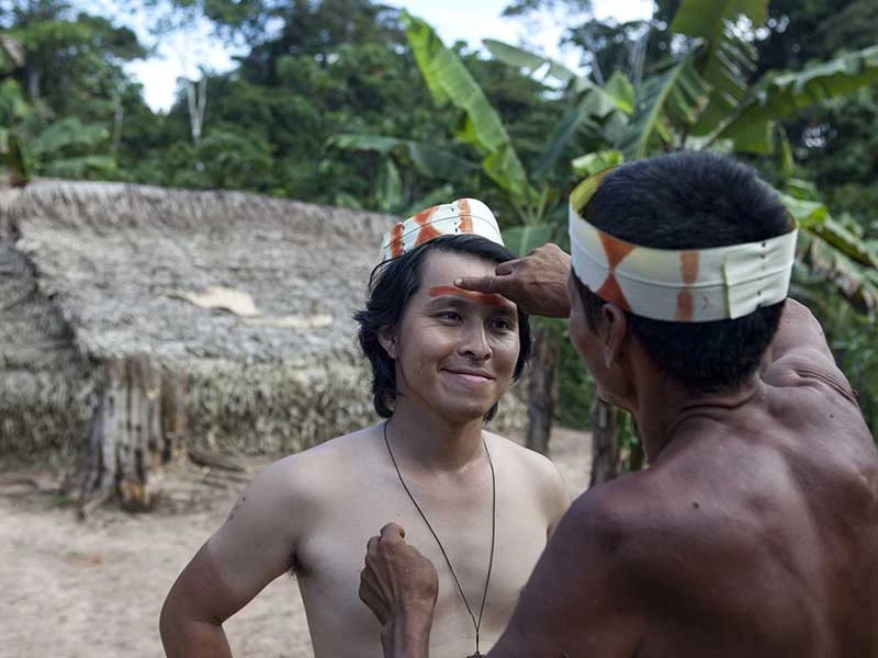 Tác giả - nhà báo Nguyễn Tập với thổ dân Matse’s trong rừng Amazon, Nam Mỹ. (Ảnh nhân vật cung cấp)