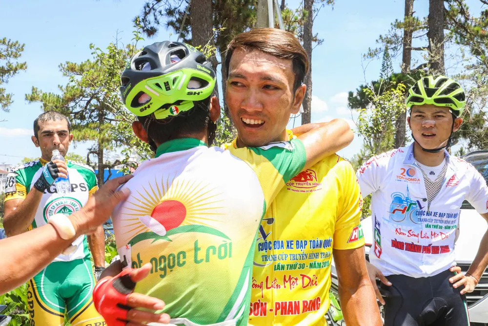 Đồng đội Lê Ngọc Sơn chúc mừng áo vàng Nguyễn Thành Tâm sau vạch đích.