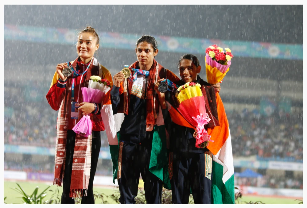 Quách Thị Lan (trái) nhận HCB châu Á trong một ngày mưa tầm tã. ẢNH: Odisha