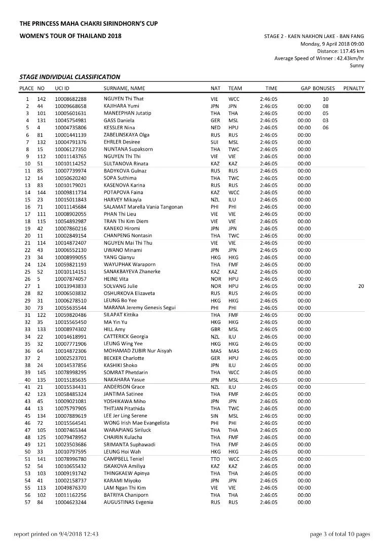 Tại mức đến Baan Fang, nhà vô địch châu Á Nguyễn Thị Thật thi đấu trong màu áo đội World Cycling Center (nơi cô tập huấn tại Thụy Sỹ chuẩn bị cho Asiad 18) tung nước rút thần tốc, đánh bại đối thủ Nhật Bản Kajihara Yumi và hạ “kỳ phùng địch thủ Đông Nam Á” Maneephan Jutatip (Thái Lan) đoạt chiến thắng sau 2 giờ 46’05”.
